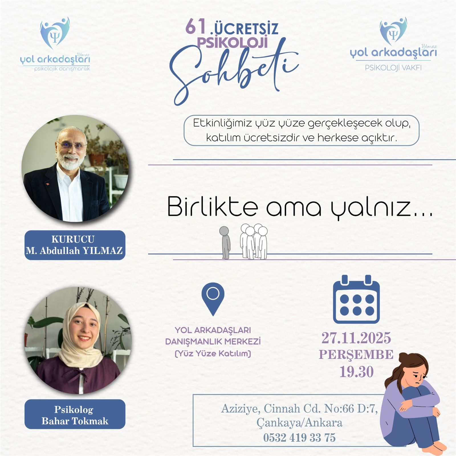 61. Ücretsiz Psikoloji Sohbetinde bu defa ilişkilerde yalnızlık duygusunu ve beraberliğin psikolojik temellerini konuşuyoruz.