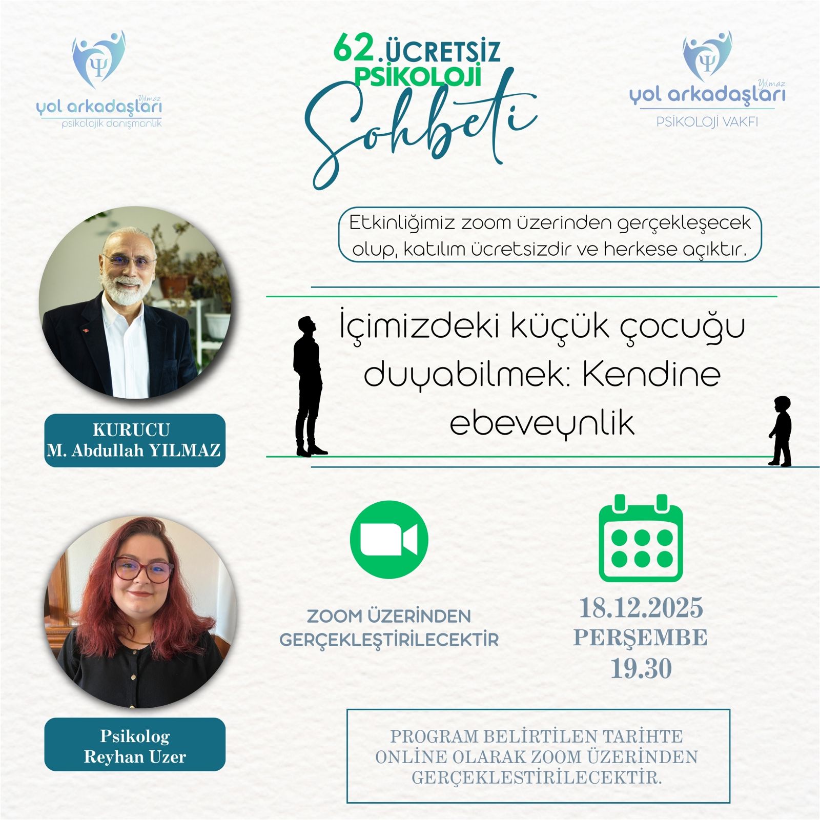 62. Ücretsiz Psikoloji Sohbetinde bu defa içsel çocuğumuzla bağ kurmayı ve kendimize şefkatle yaklaşmayı konuşuyoruz.